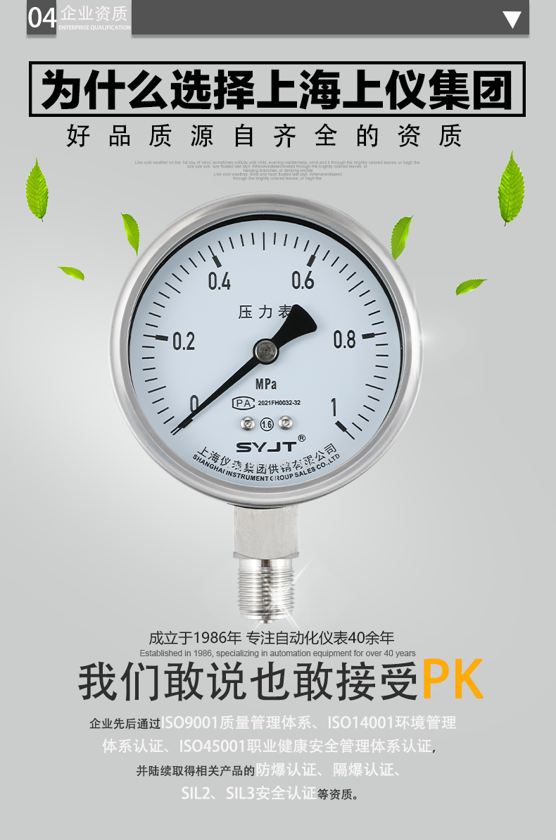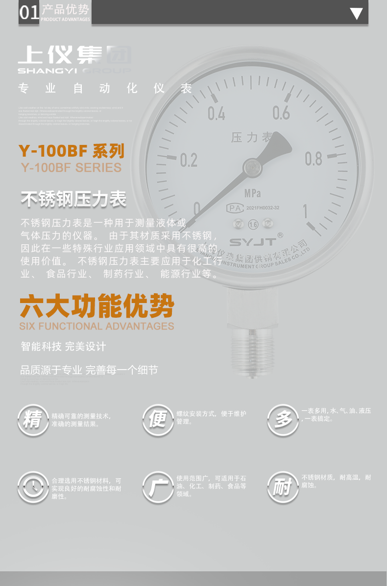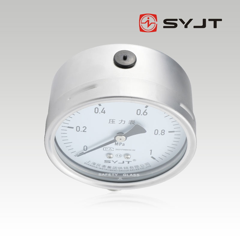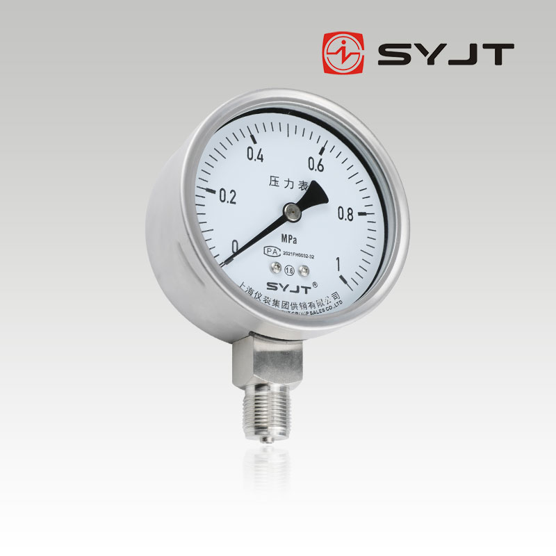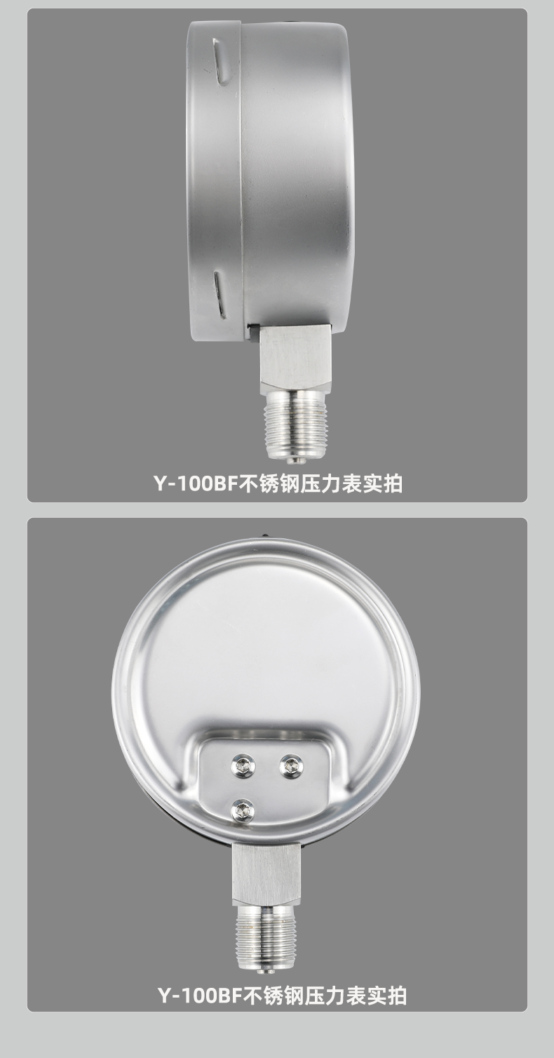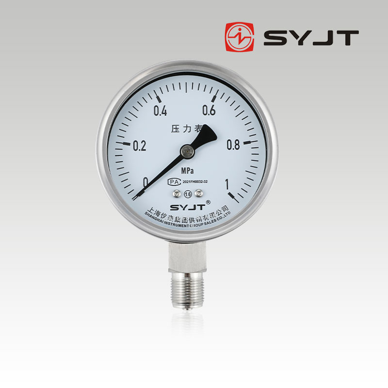 上(shàng)儀Y-100BF不鏽鋼壓力表不鏽鋼壓力表廣泛用於石油、化工、化纖、冶金、電站等工業部門中對耐腐、抗振有較(jiào)高要求的工藝流(liú)程中(zhōng)測量各種流體介質的(de)壓力。