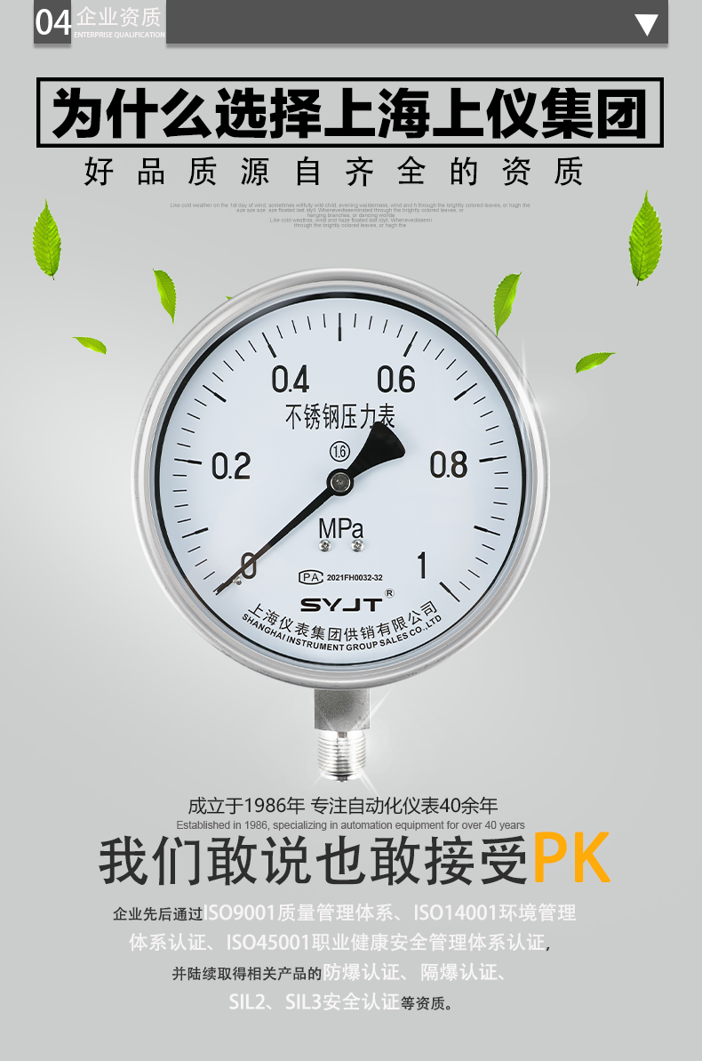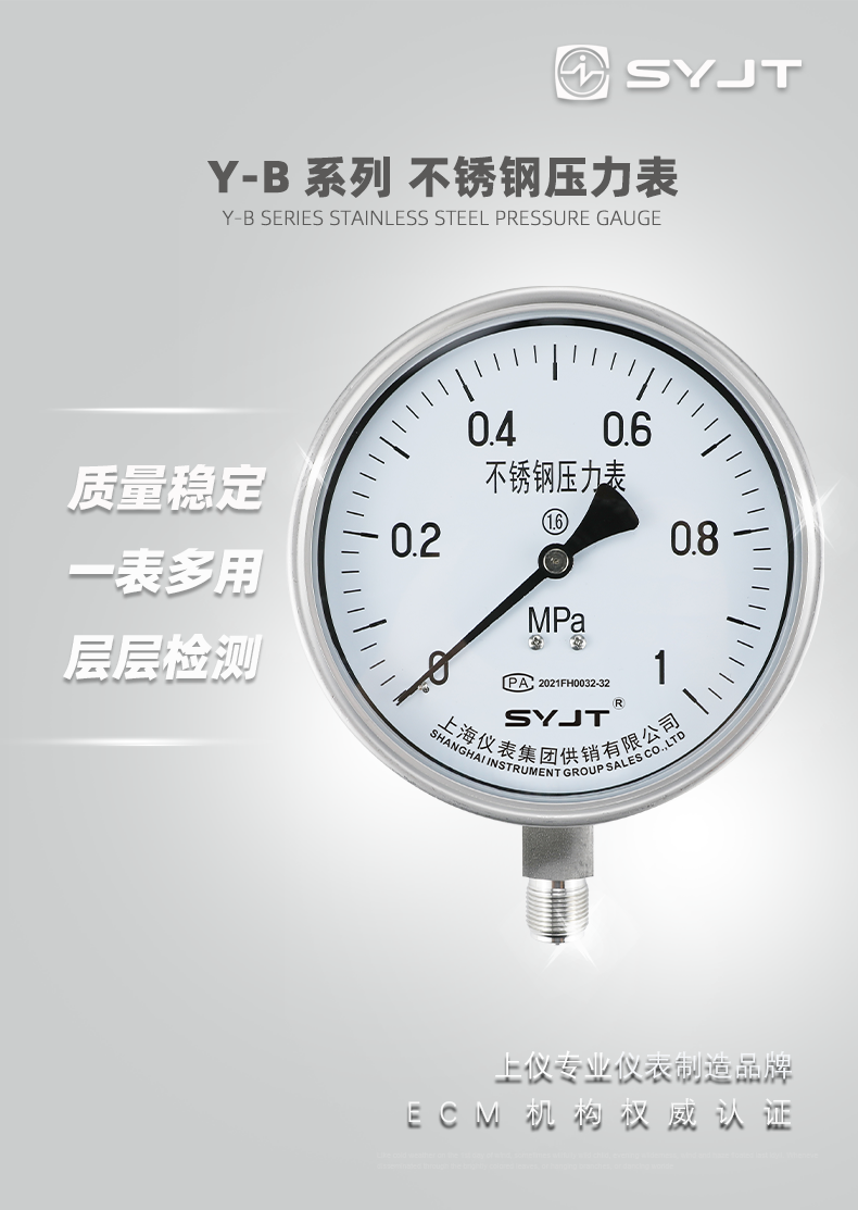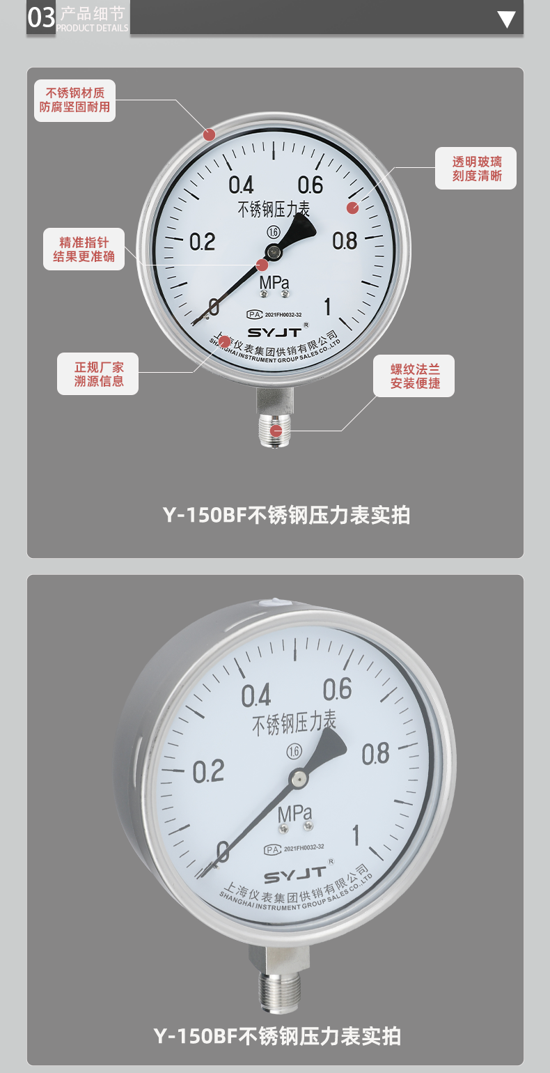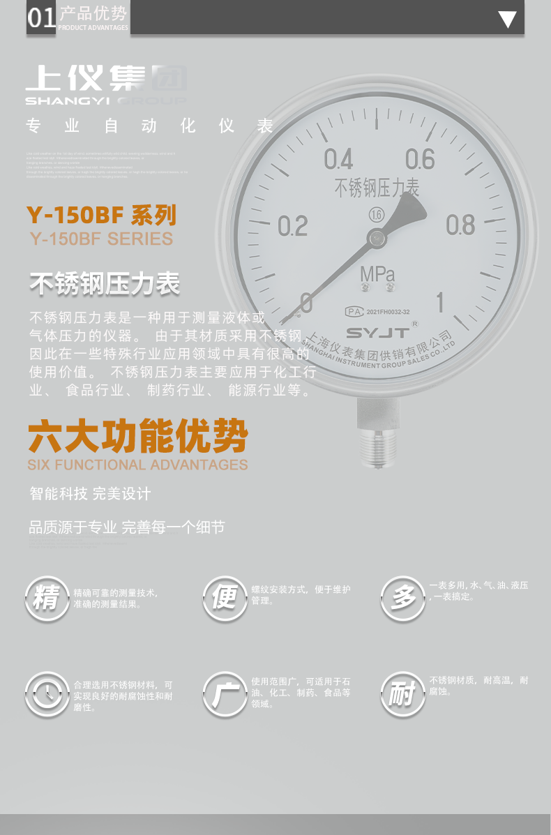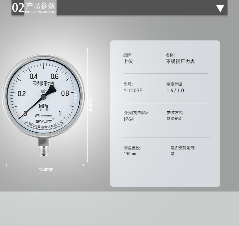 www91ncomY-150BF不鏽鋼壓力表不(bú)鏽鋼壓力(lì)表(biǎo)廣泛用於石油、化工、化(huà)纖、冶金、電站等工(gōng)業部門(mén)中對耐腐、抗振有較高要求(qiú)的工藝流程中測量各種(zhǒng)流體介質的壓(yā)力。