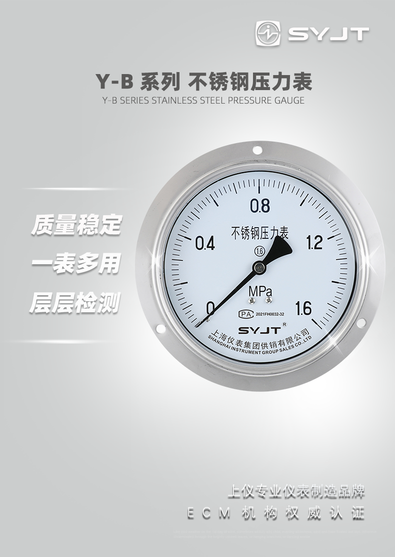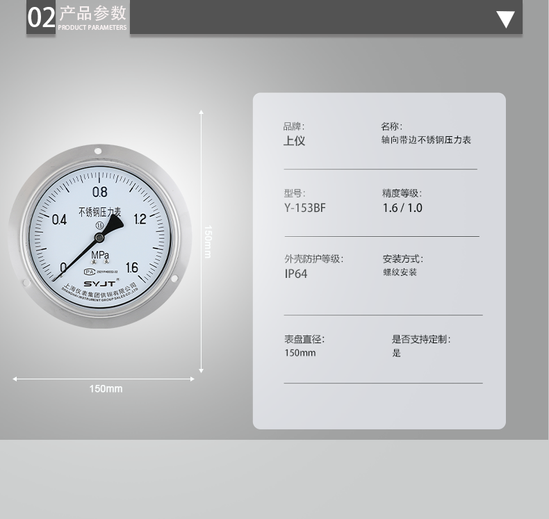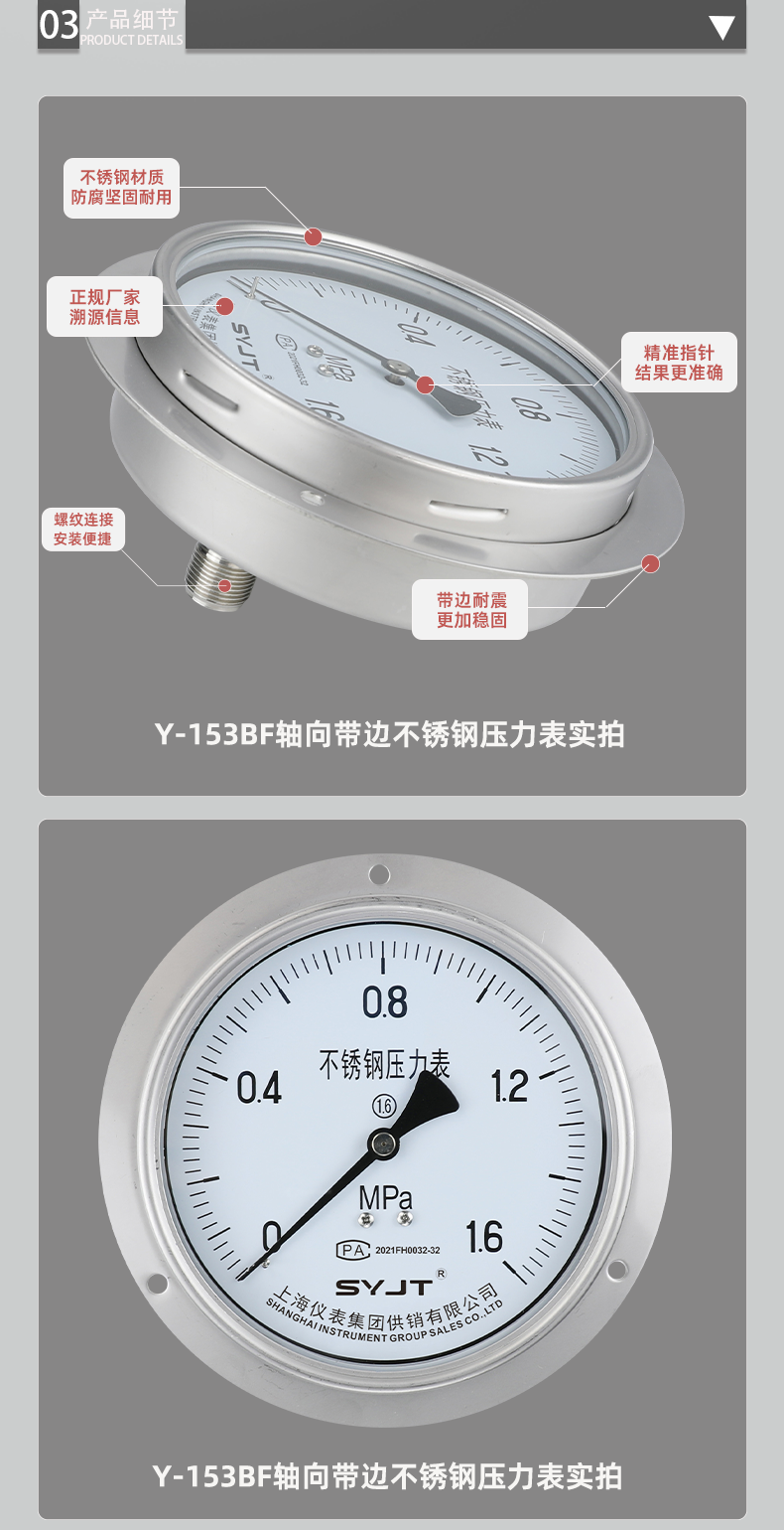 www91ncom集團Y-153BF軸向帶邊(biān)不鏽鋼壓(yā)力表,不(bú)鏽鋼壓力表廣泛用於石(shí)油(yóu)、化工、化纖、冶金、電站等工(gōng)業部門中對耐腐(fǔ)、抗(kàng)振有(yǒu)較高要求的工藝流程中測量各(gè)種流體介質的壓力。本儀表的整體結構設計合(hé)理、工藝精致,具有(yǒu)較高的測量**度和持久的穩定性,因此不僅可提供出口,尤為國(guó)內用戶對···