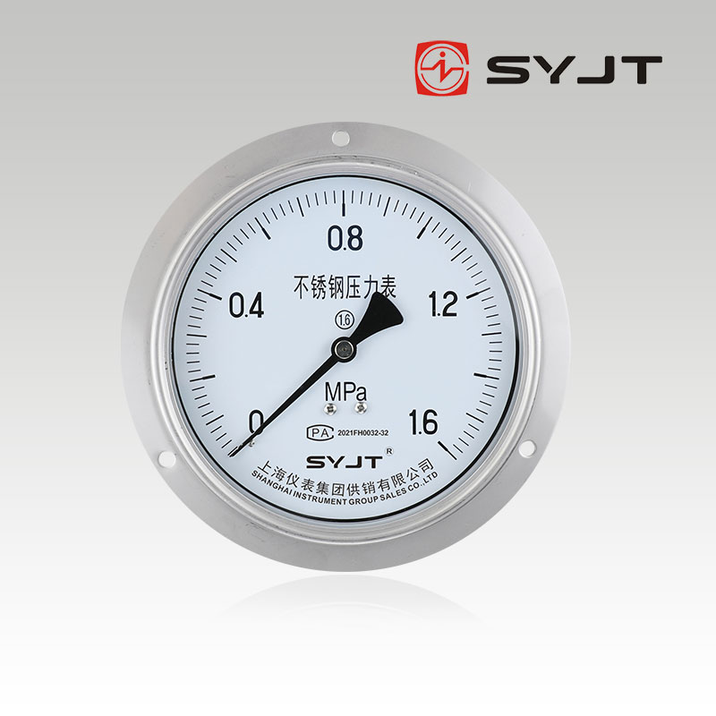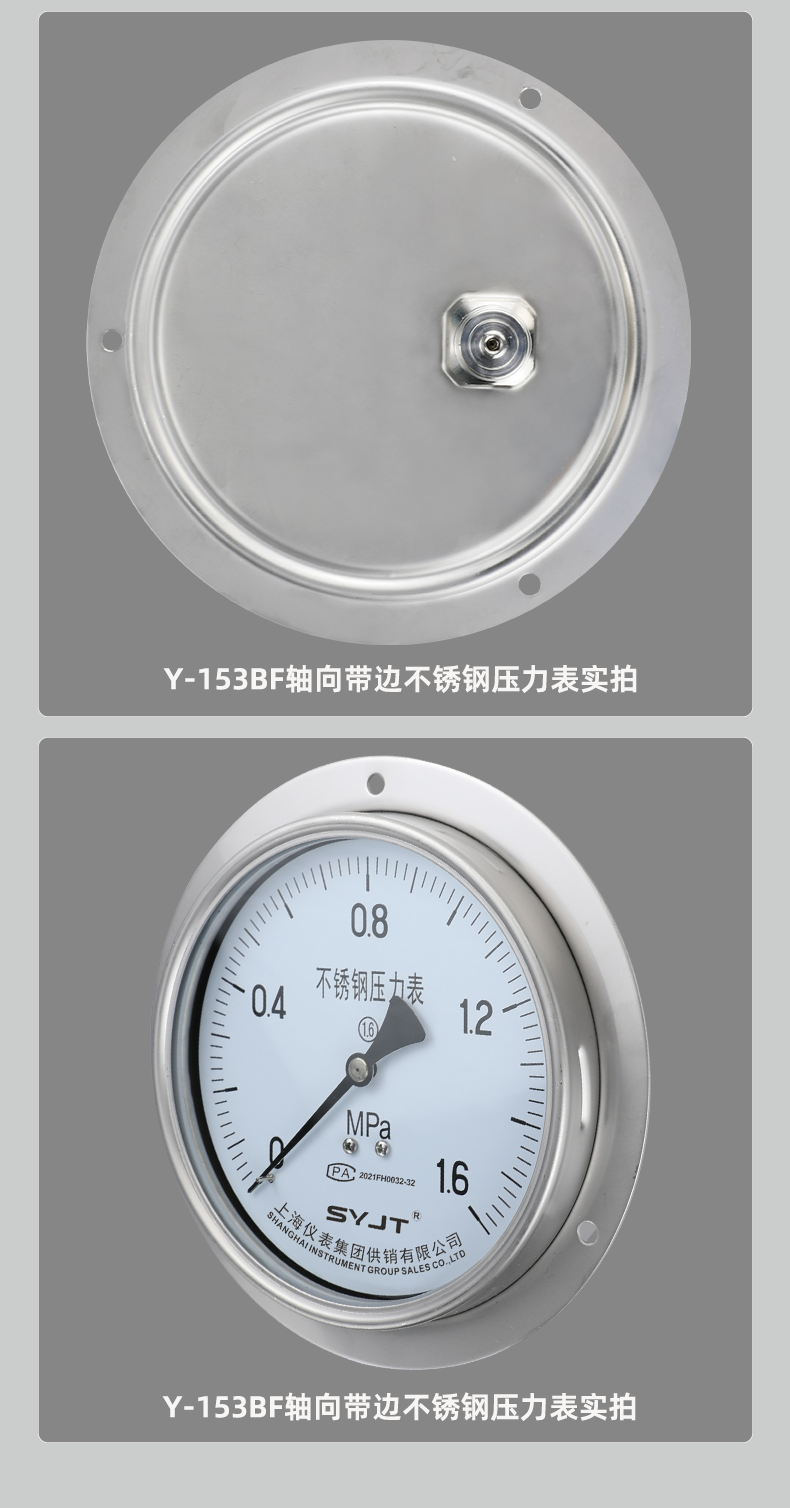 www91ncom集團Y-153BF軸向帶邊(biān)不鏽(xiù)鋼壓力表,不鏽鋼壓力表廣泛用於石油、化工、化纖、冶金、電站等工業部門中(zhōng)對耐腐、抗振有較高要求的工藝流程中測量各種流體介質的壓(yā)力。