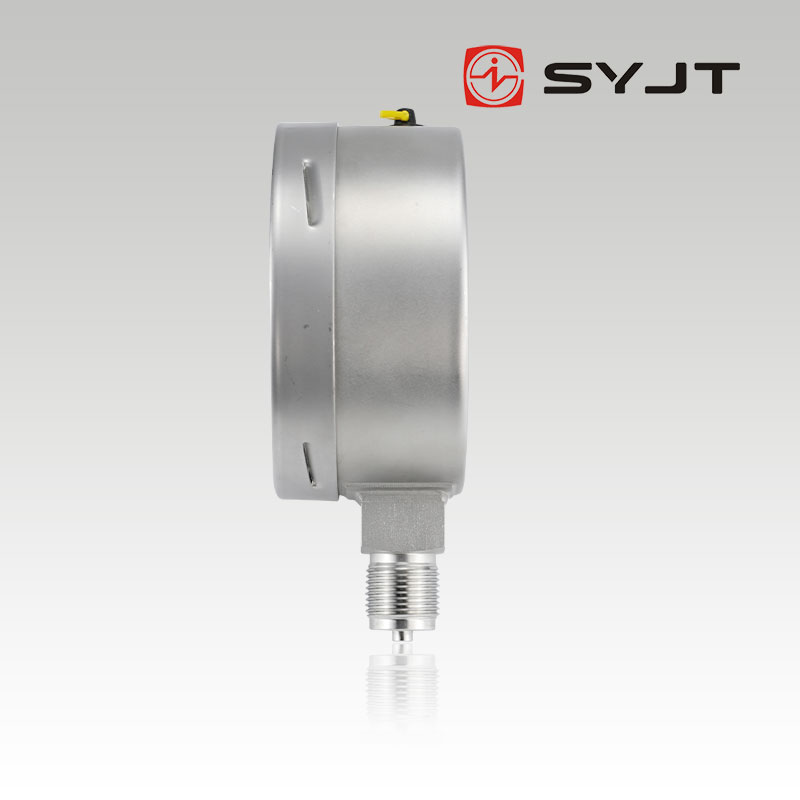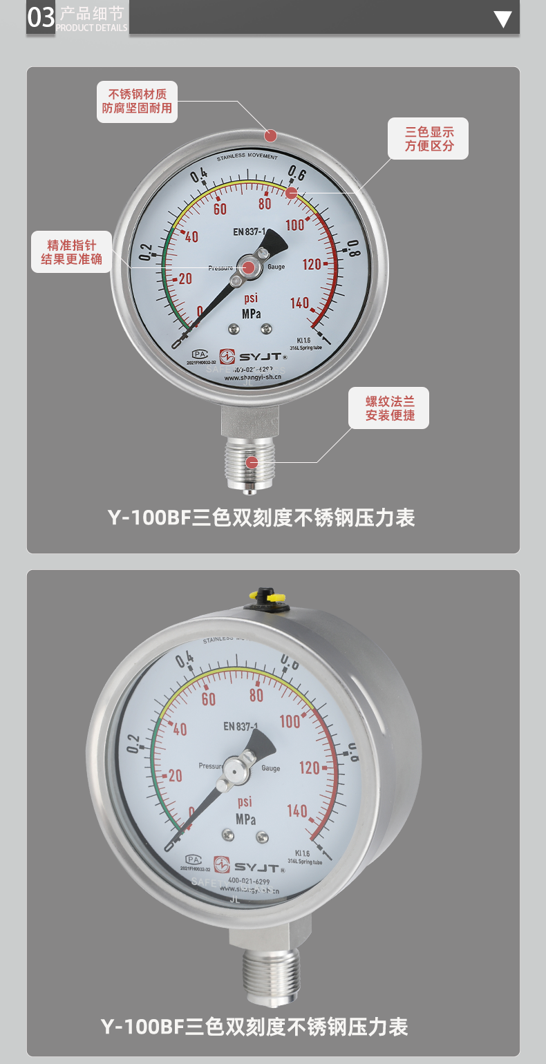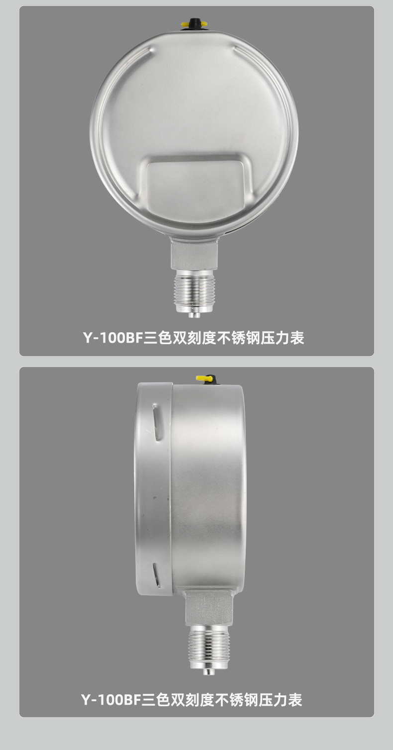 www91ncom集團Y-100BF三色(sè)雙刻度(dù)不鏽鋼壓力表,廣泛用於石油、化工、化纖、冶金、電站等工(gōng)業部門中對耐腐、抗振有較(jiào)高(gāo)要求的工藝流程中測量各種流體介質的壓力。