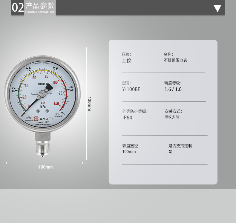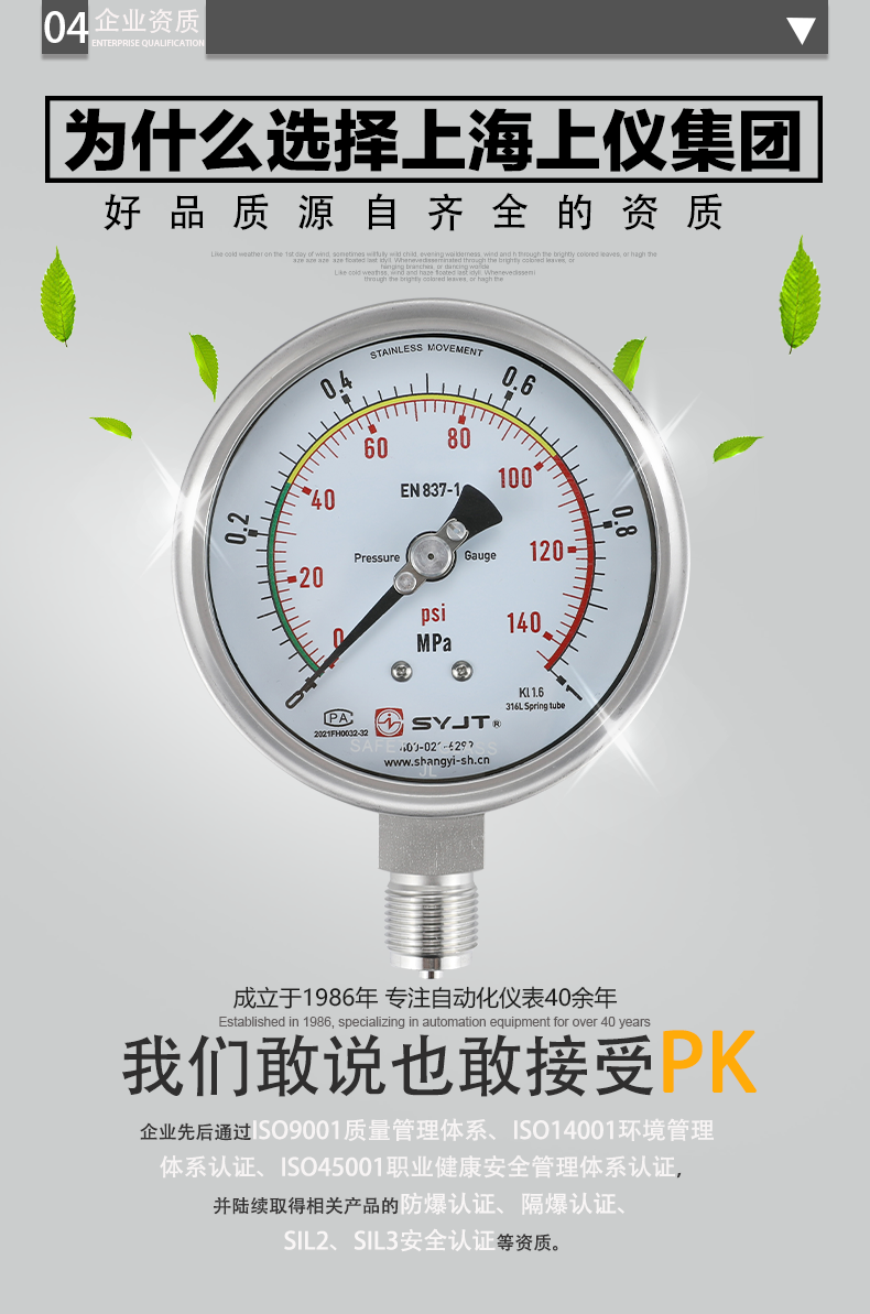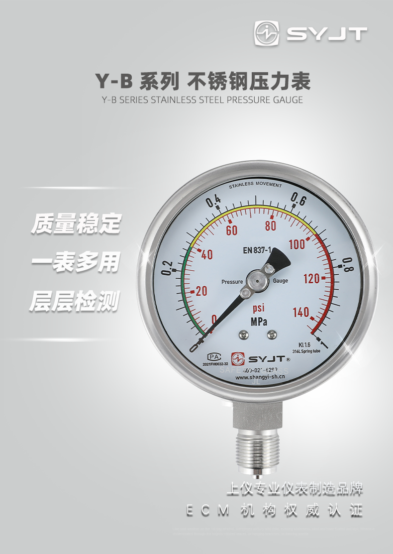 www91ncom集團Y-100BF三色雙刻度(dù)不(bú)鏽鋼壓力(lì)表,廣泛用於石油、化工(gōng)、化纖、冶金、電站(zhàn)等工業部門中對耐腐(fǔ)、抗振有較高要求的工藝流程中測量各種流體介質的壓力。本儀表的整體結構設計合理、工藝精(jīng)致,具有較高的測量**度和持久的穩定性,因此不僅可(kě)提供出(chū)口,尤為國內用戶對引進(jìn)國外先···