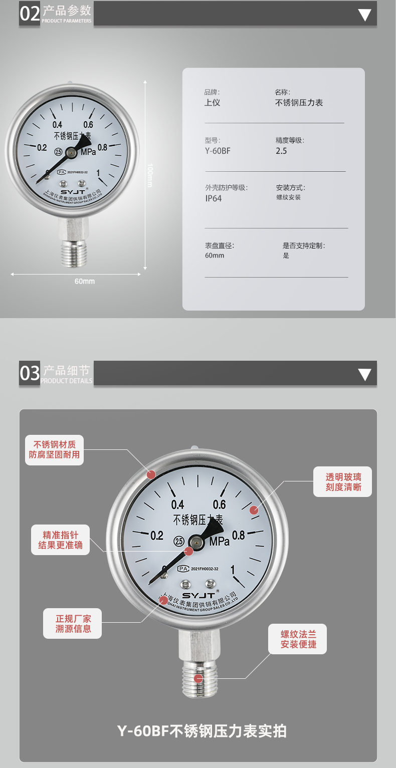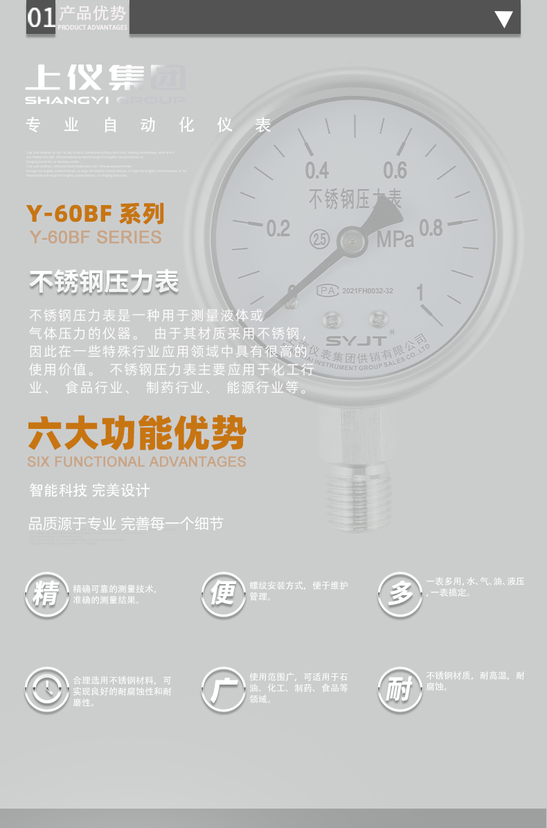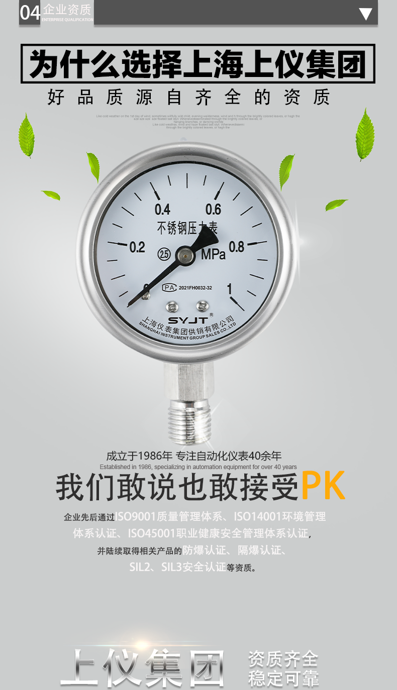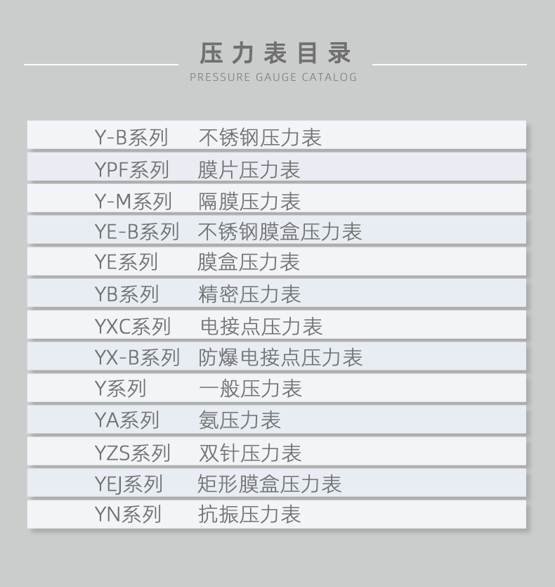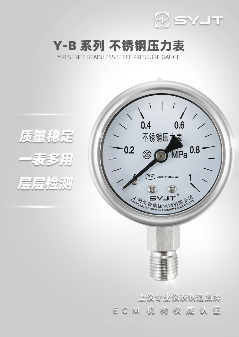 不鏽鋼壓力表廣泛用於石油、化工(gōng)、化纖、冶金、電站等工業部門(mén)中(zhōng)對耐腐、抗振有較高要求的工藝流程中測量(liàng)各(gè)種流體介質的(de)壓力。本儀表的整(zhěng)體結構(gòu)設計合理、工藝(yì)精致,具有較高(gāo)的測量**度和持久的穩定性,因此(cǐ)不僅可提供出口,尤為國內用戶對引進國外先進技術裝備中的(de)同類儀表實(shí)現···