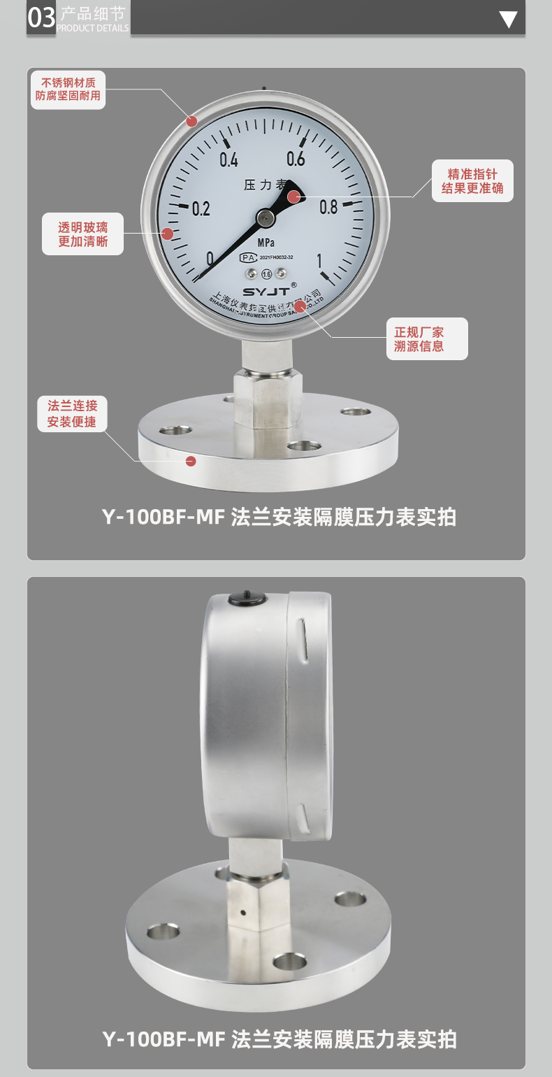 www91ncom集團Y-100BF-MF法蘭(lán)安裝隔膜(mó)壓力表,廣泛(fàn)用於石油、化工、化纖、冶金、電站等工業部門中對耐腐、抗振有較高要求的(de)工藝流程中測量各(gè)種流體介質的壓力。本儀表的整體結構設計合理、工藝精致,具有較高的測量**度和持久的穩定性,因此不僅可提(tí)供出口,尤為(wéi)國內用戶對引進國外先···