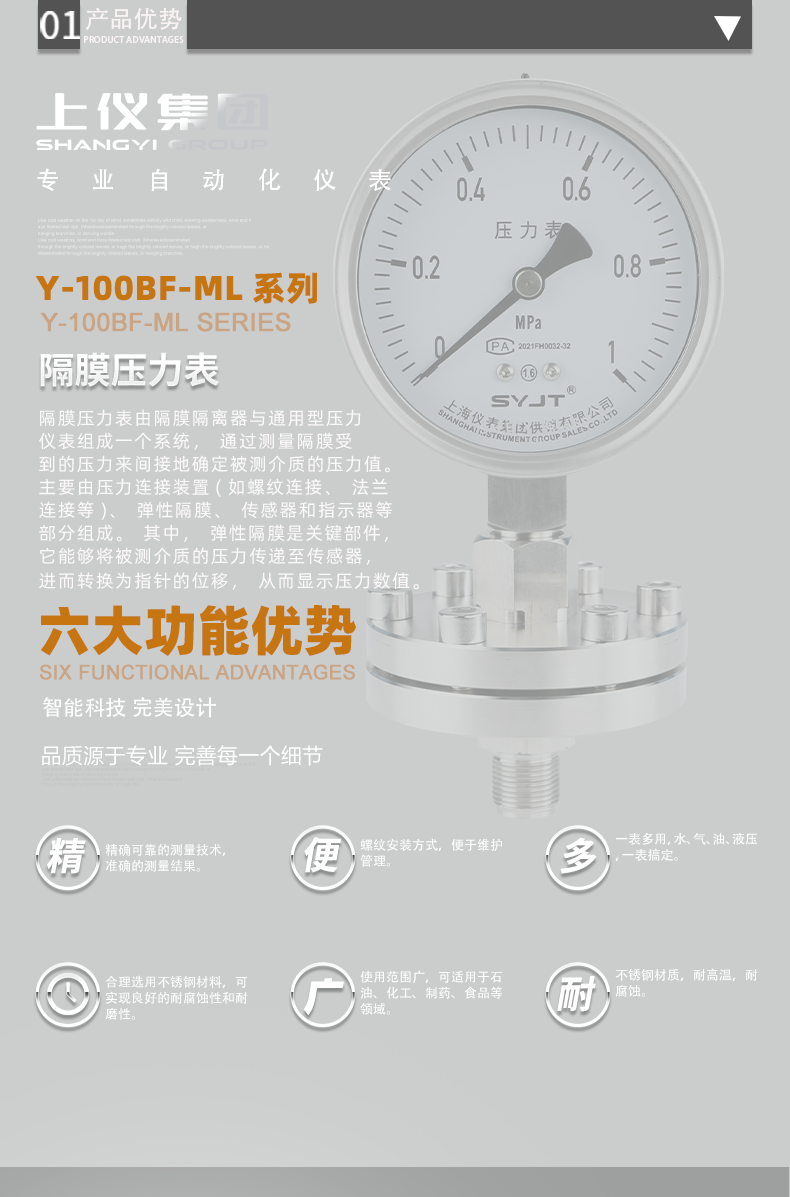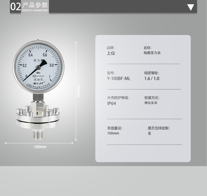 一、產品簡介:Y-100BF/ML螺紋式不鏽(xiù)鋼隔膜壓力表廣(guǎng)泛用於石油、化工、食品等(děng)部門生產過程中測量具有腐蝕性、高粘度、易結晶、含有固體狀顆(kē)粒、溫度較高的液體介質的壓力。二(èr)、Y-100BF/ML螺紋式不鏽鋼隔膜壓力表產品型號:1、型號:Y-100BF/ML;2、表麵直徑(jìng):φ100mm;3、膜片材料:O···